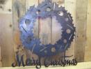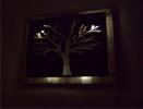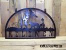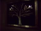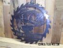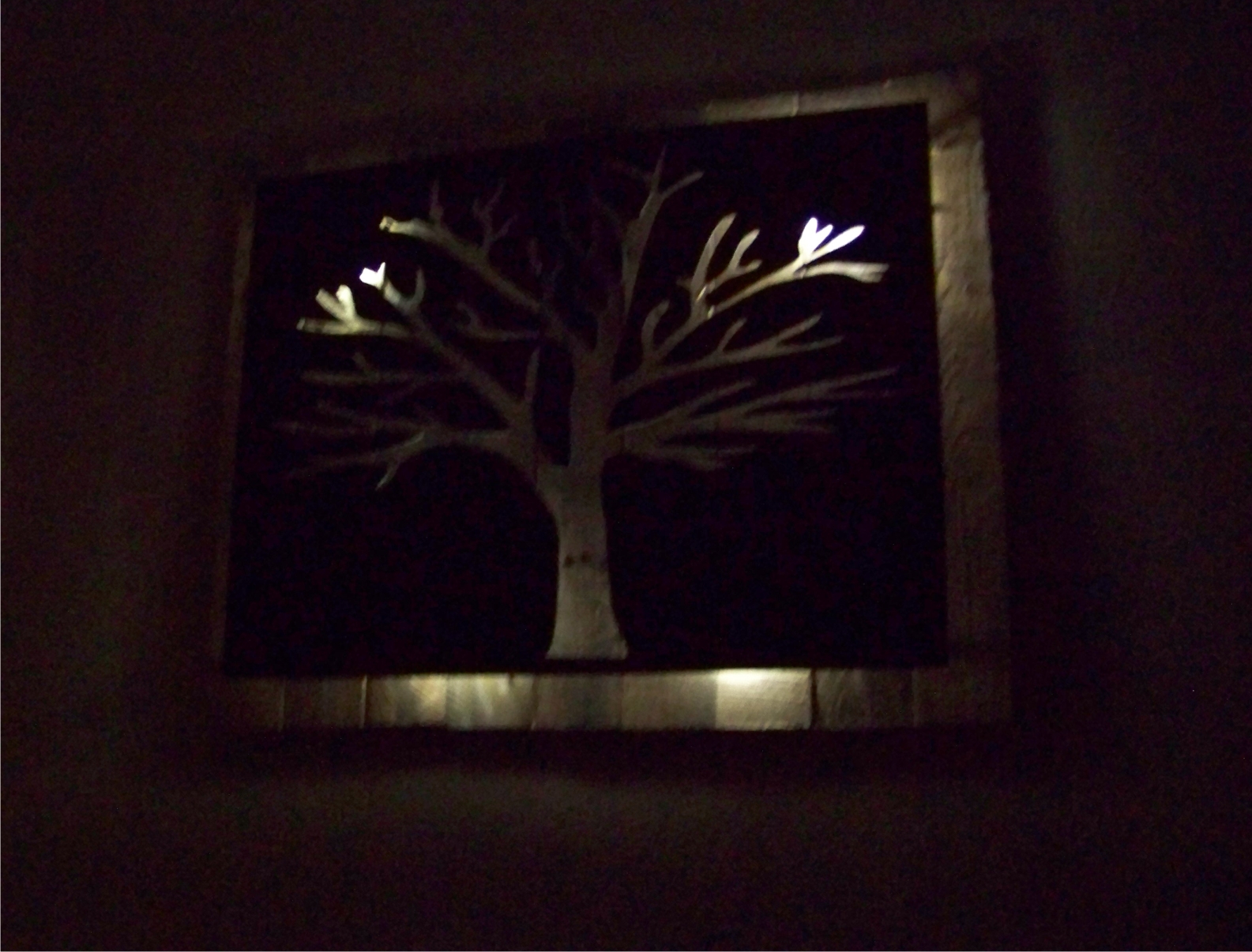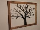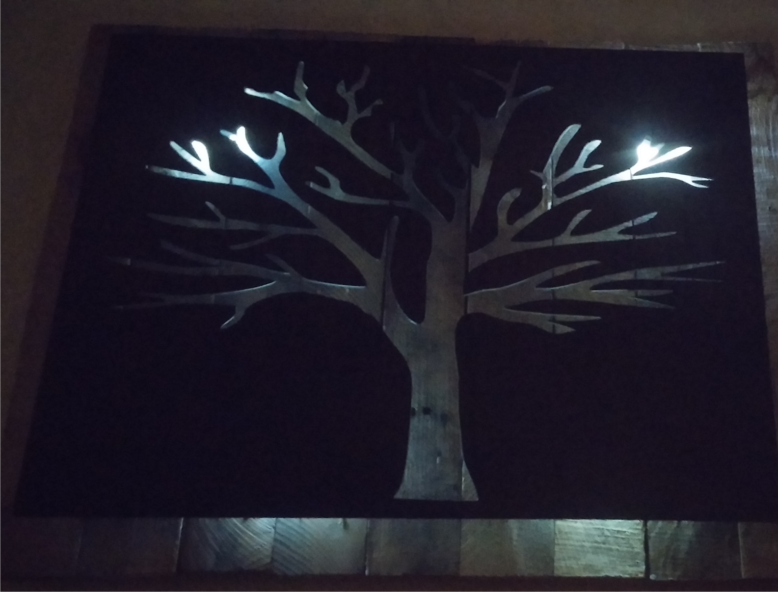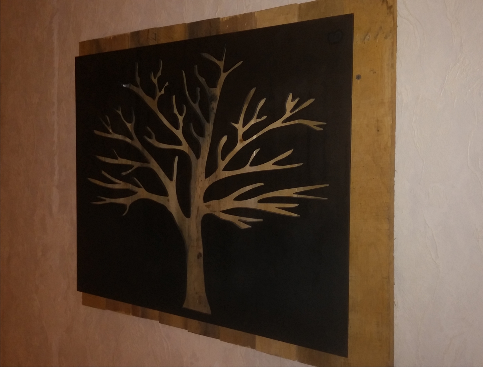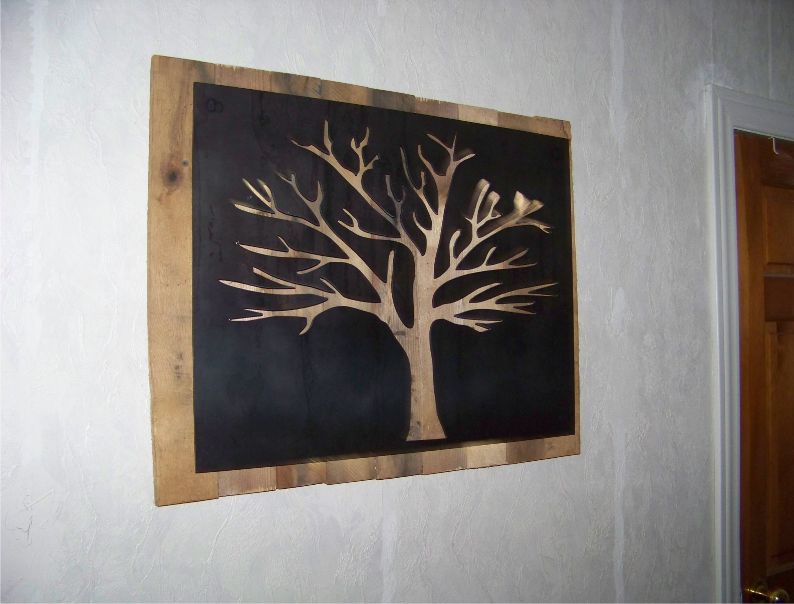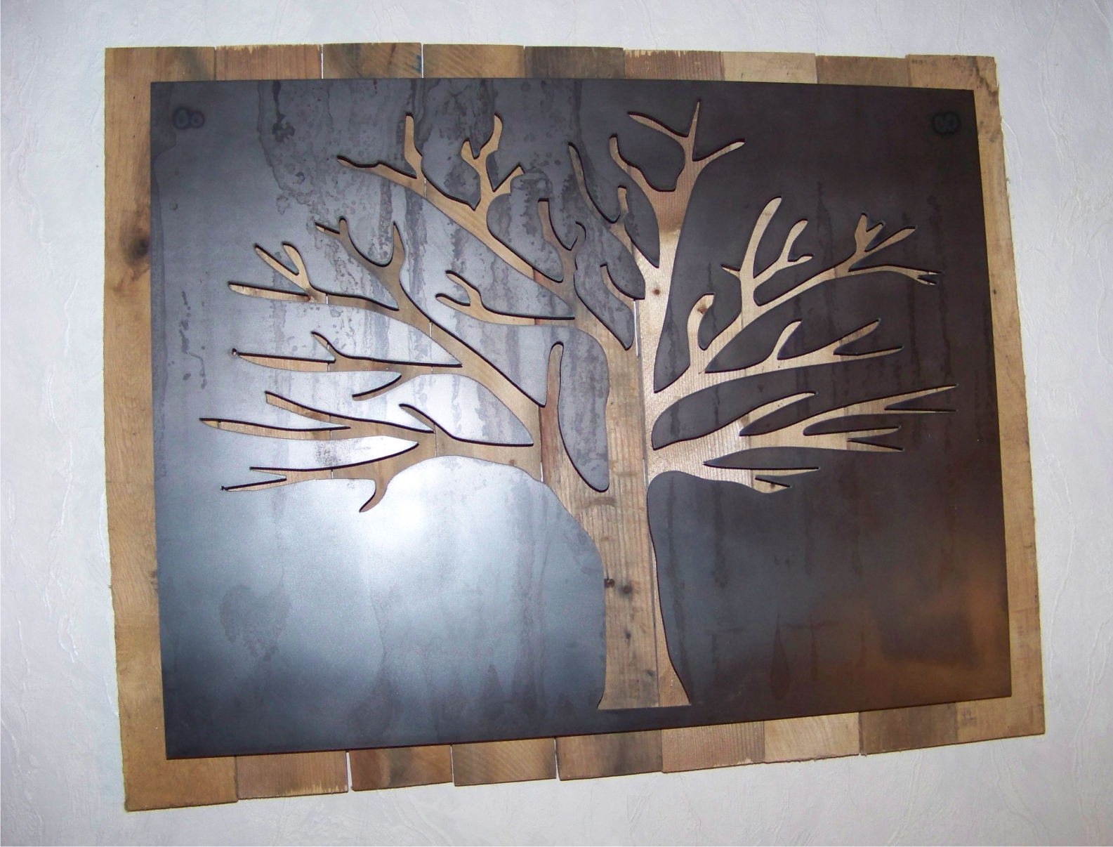 metal cut out tree with reclaimed wood backdrop finished with